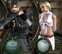 Ashley Graham appears in a complete medieval suit of armor. Only part of her face can be seen normally. When aiming a gun at her the face protection lowers itself. The suit makes her invincible to every enemy attack and any attacks by Leon. She also cannot be picked up by enemies, as they will immediately drop her and fall over themselves. When Leon catches Ashley from a fall, the animation will be different than usual, where he will flinch from the weight.
